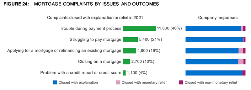 When submitting mortgage complaints, consumers specify the type of mortgage. In 2021, conventional home mortgages were the most complained about mortgage type (Figure 23). Consumers also identify the issue that best describes the problem they experienced. The most common issue was trouble during the payment process (Figure 24).